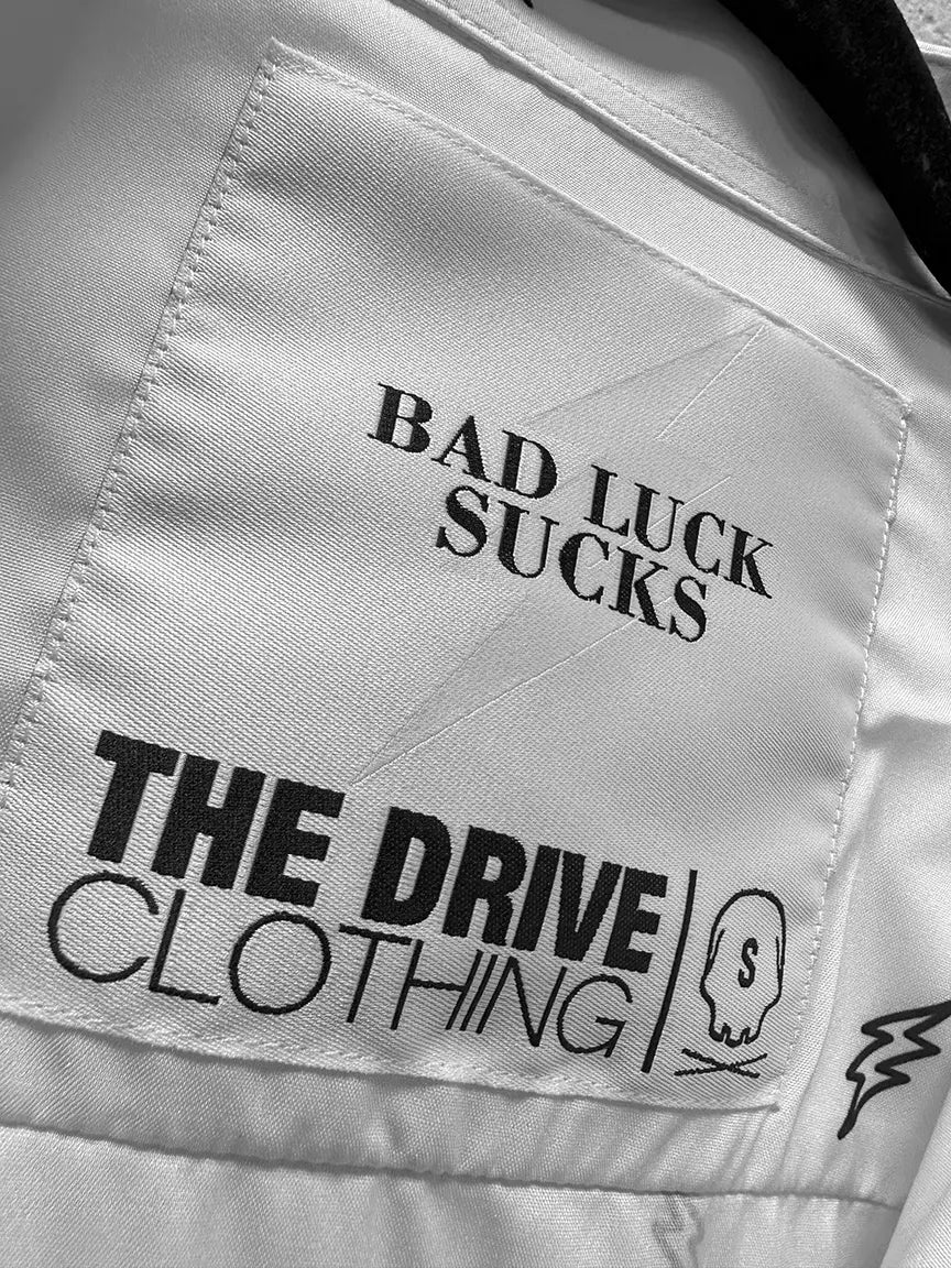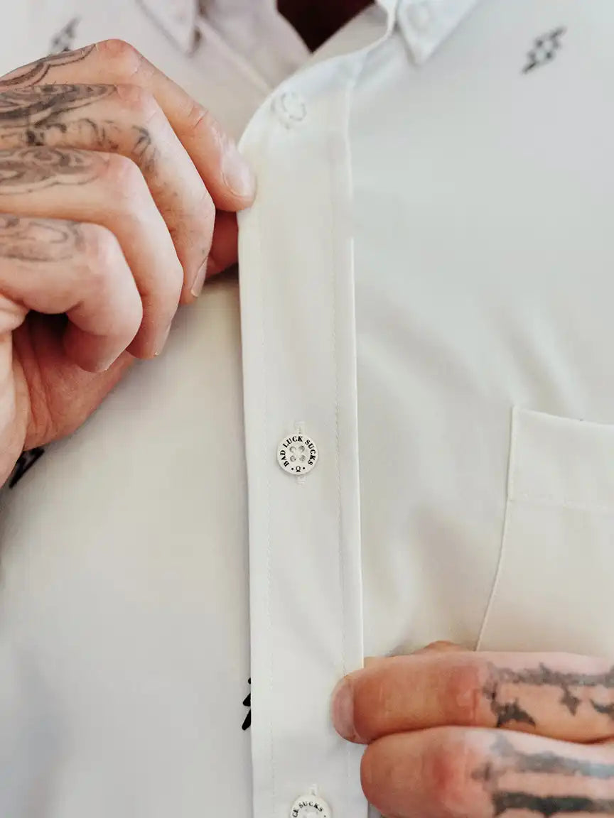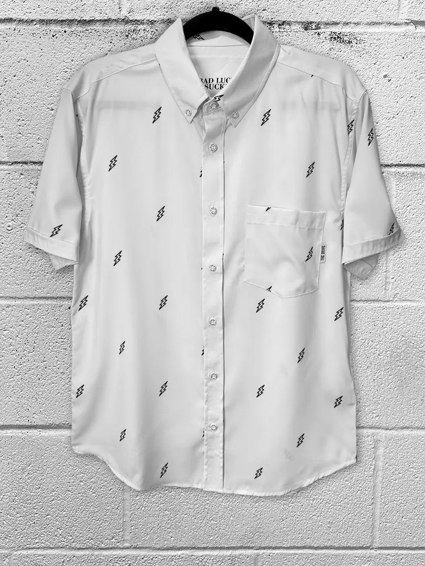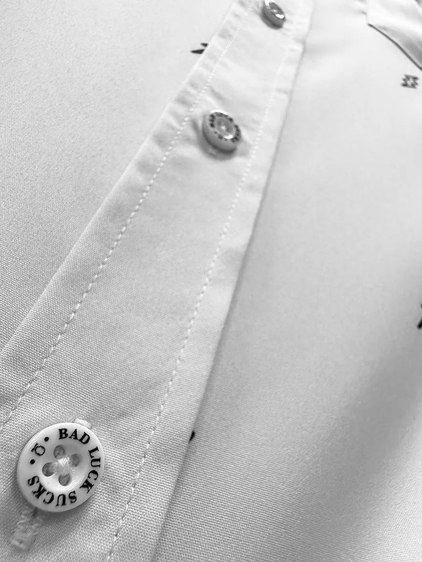 ESSENTIAL BAD LUCK SUCKS WHITE BUTTON UP