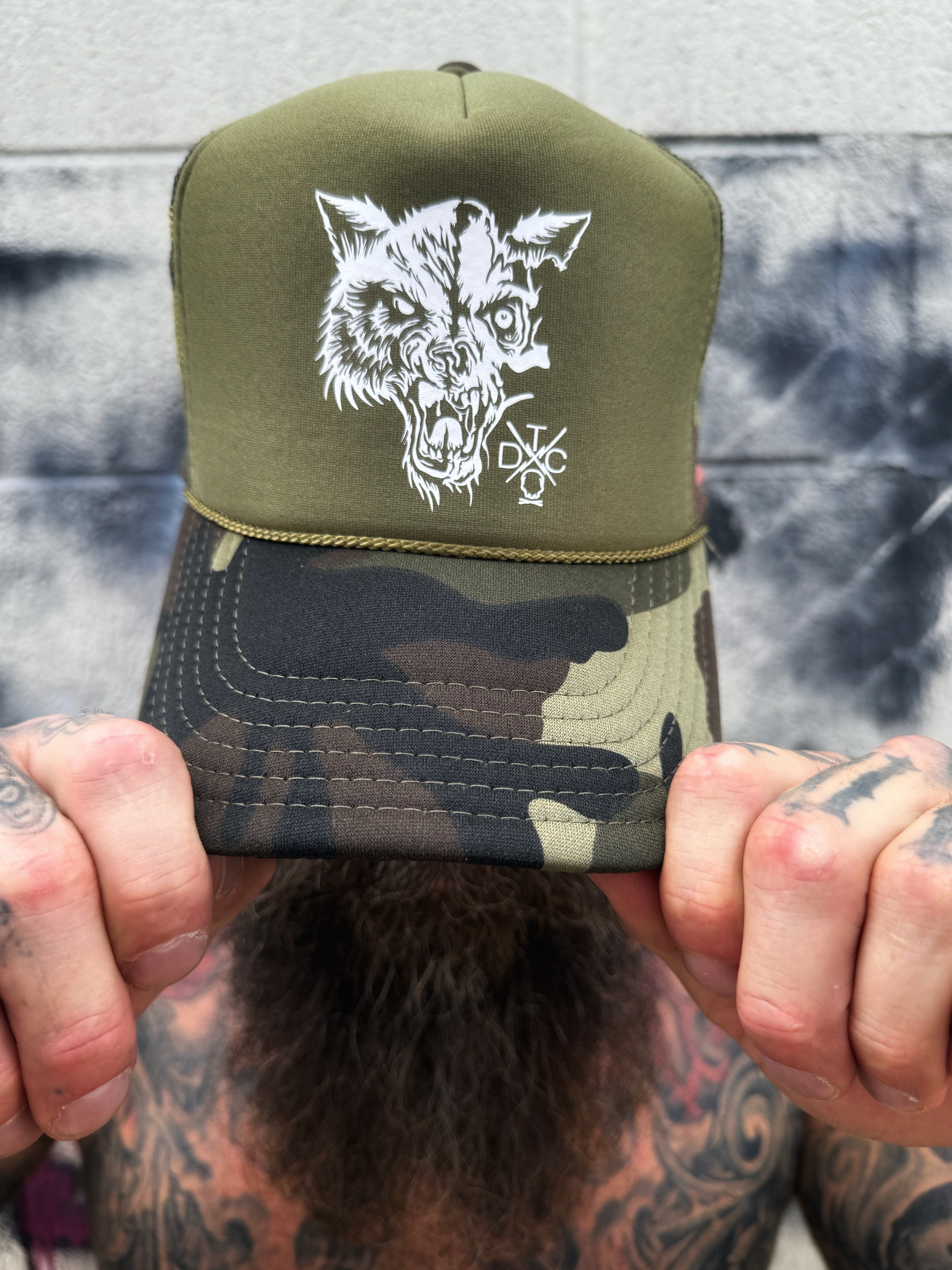 LONE WOLF HEAD FOAM CURVED BILL GREEN CAMO HAT
