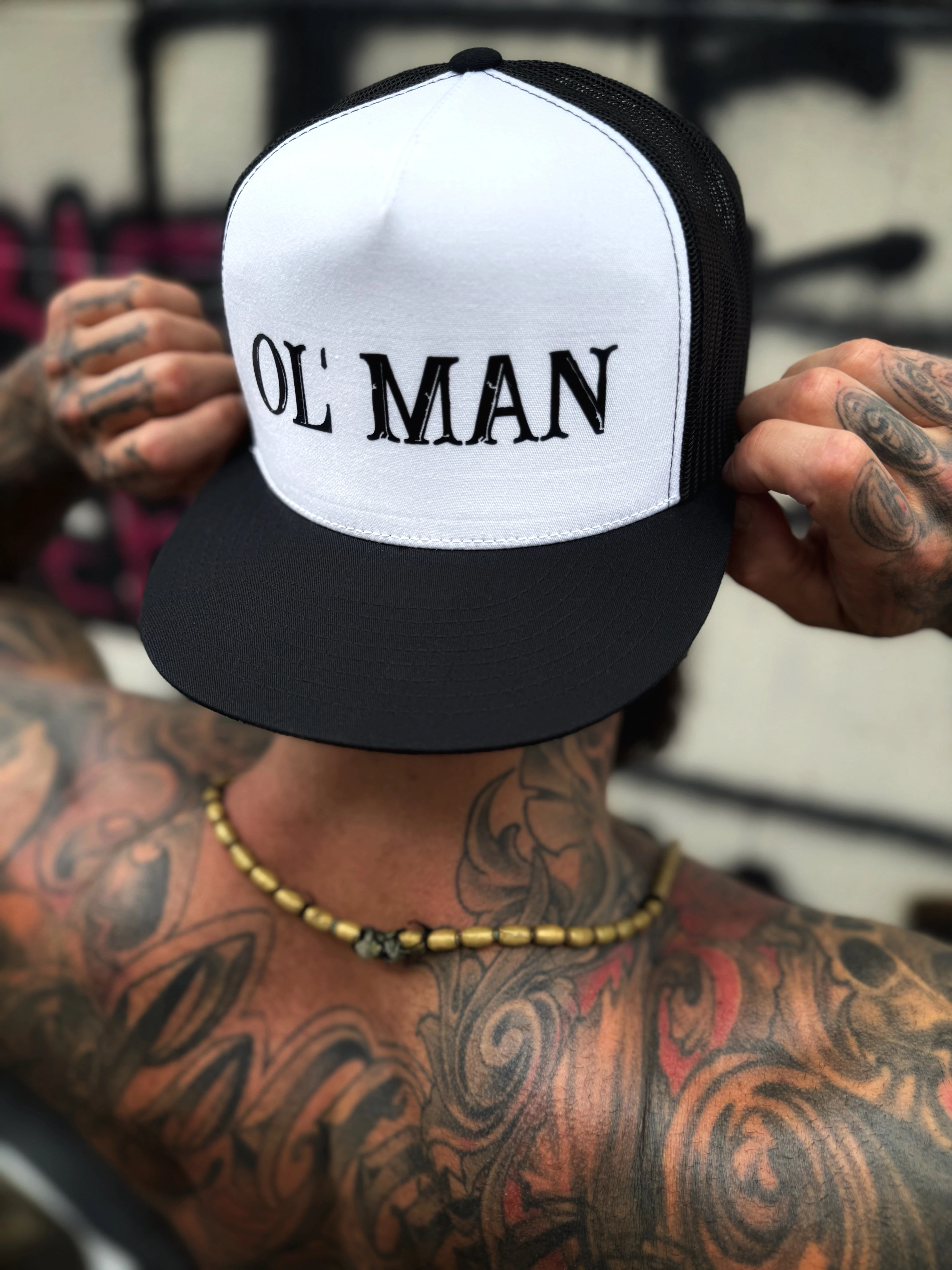 OL MAN BLACK & WHITE FLAT BILL HAT