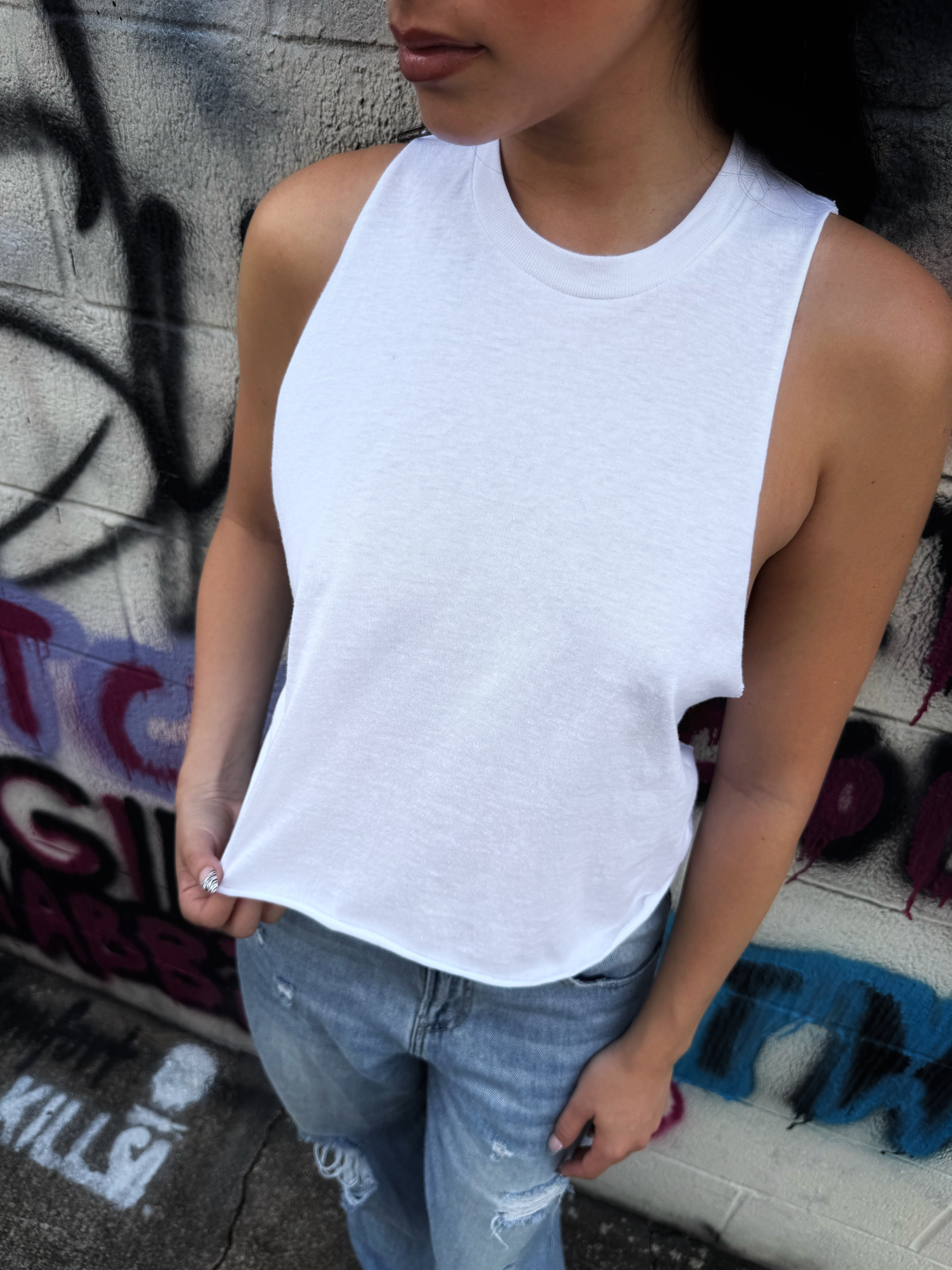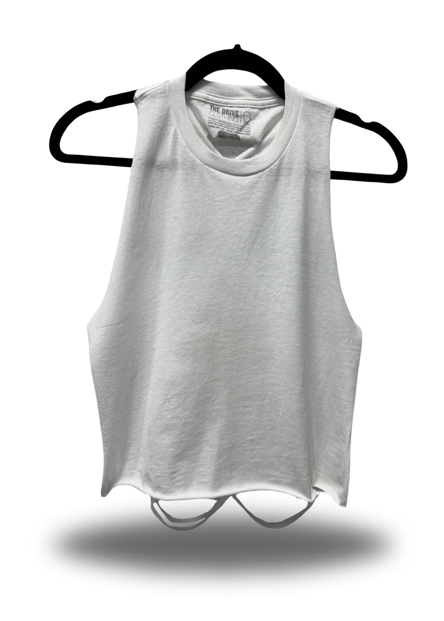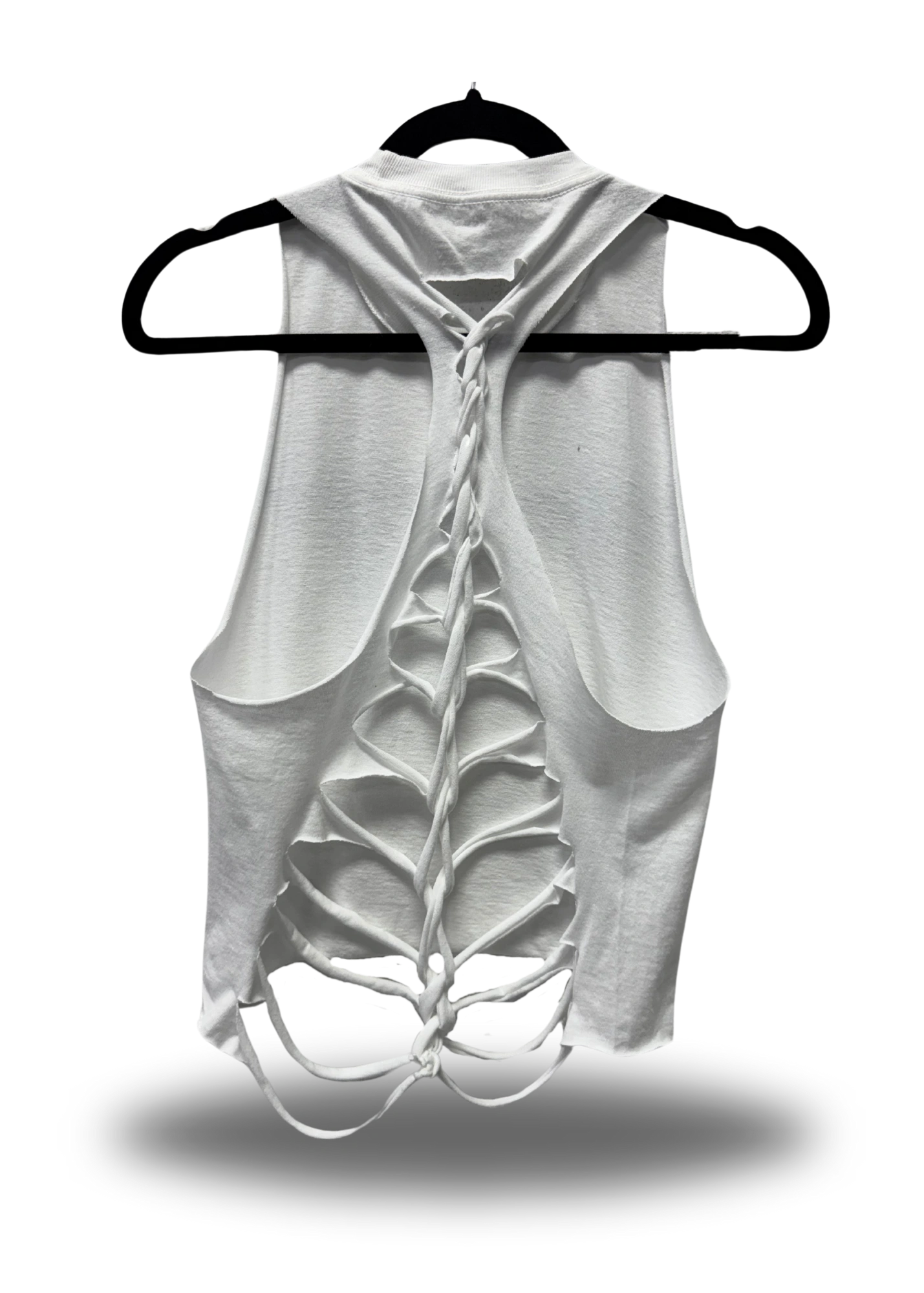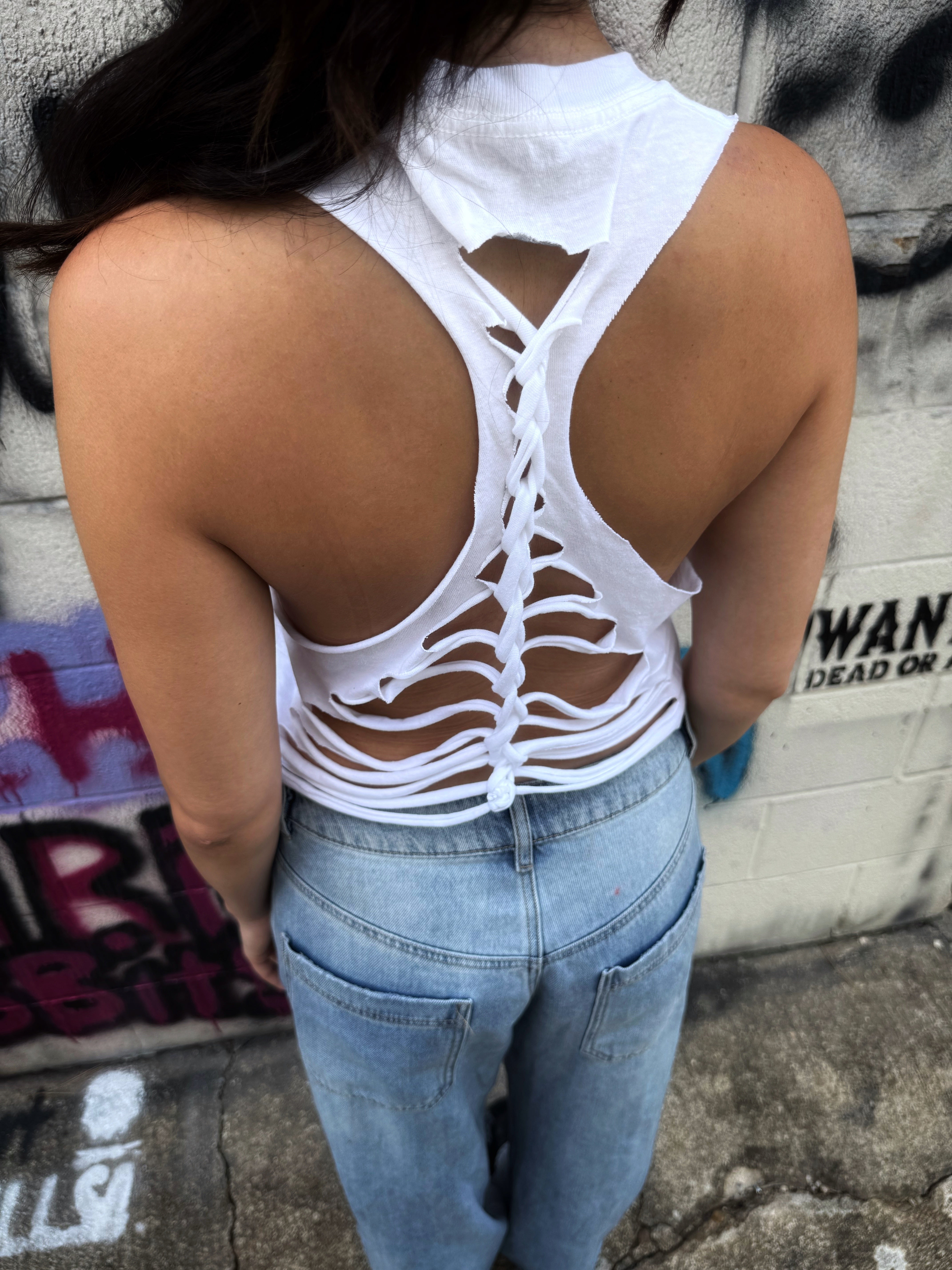 ROAD RASH BACK SLASHED AND BRAIDED WHITE CROP TANK TOP