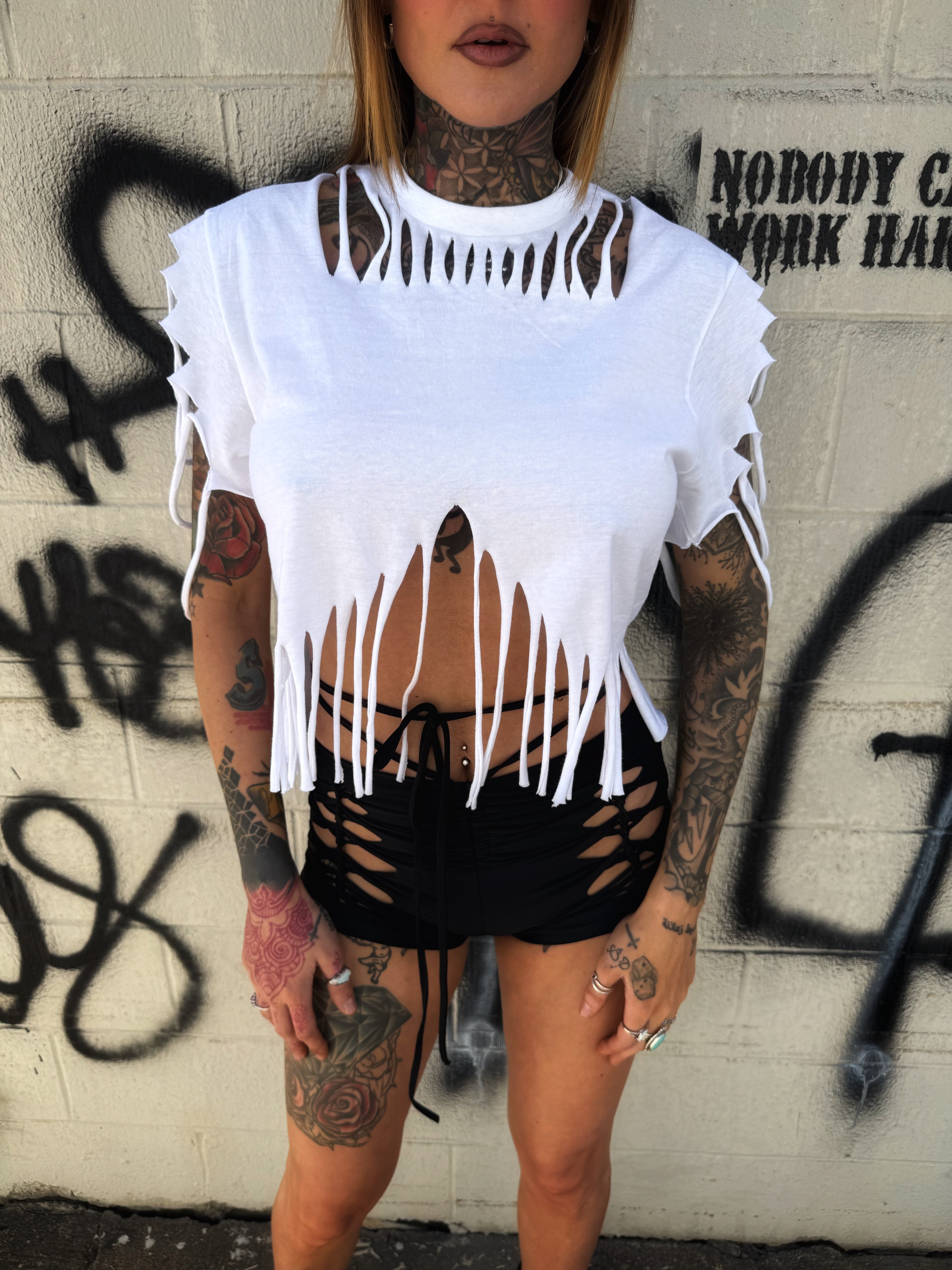 ROAD RASH FRONT FRINGE WHITE CROP TOP