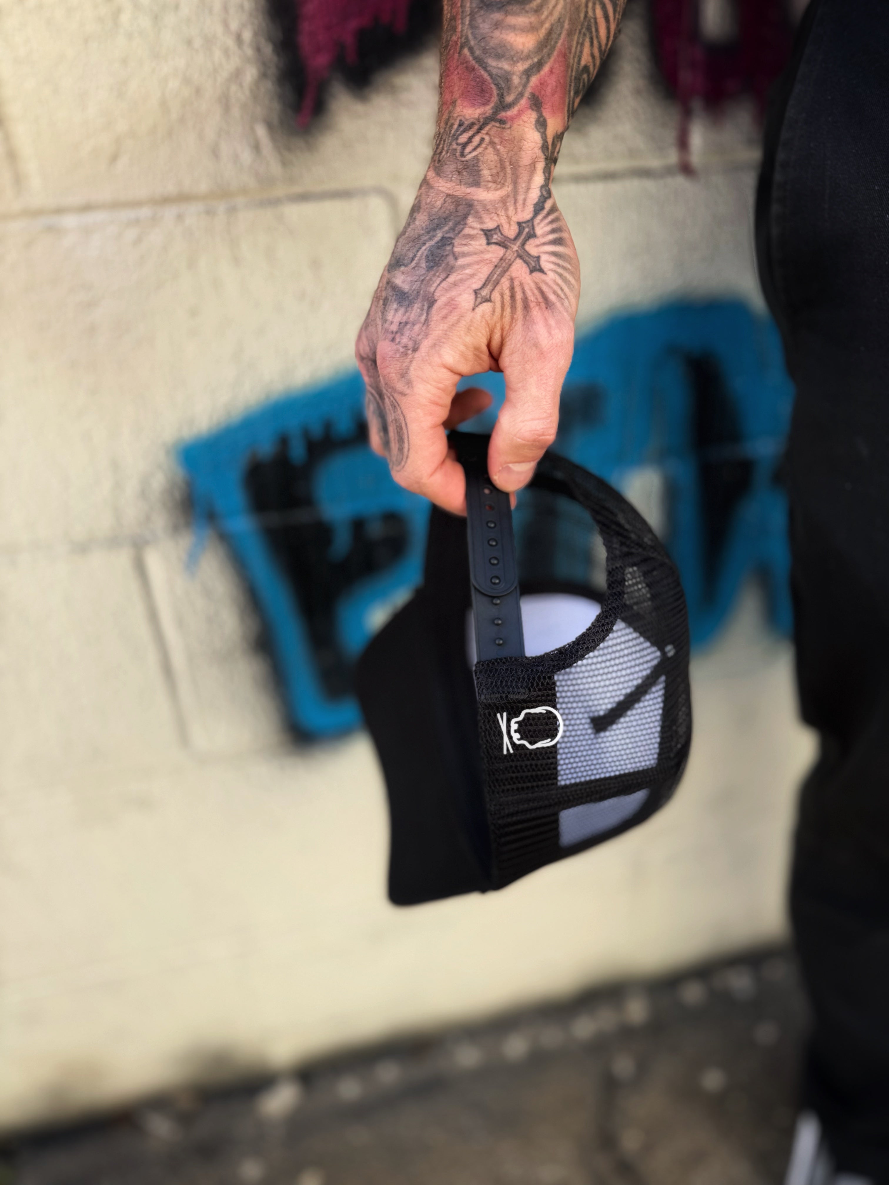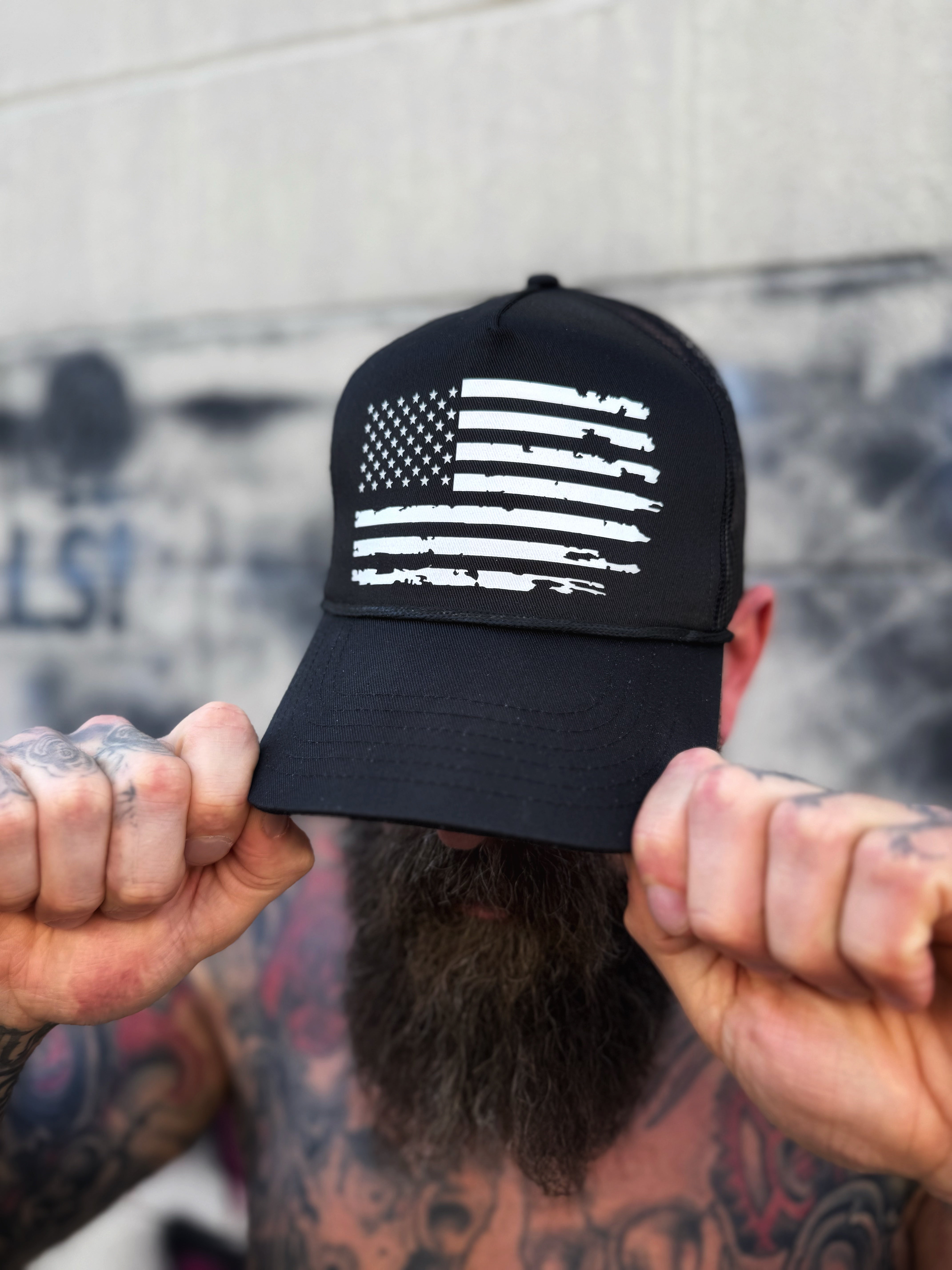 USA FLAG WHITE CURVED BILL BLACK HAT