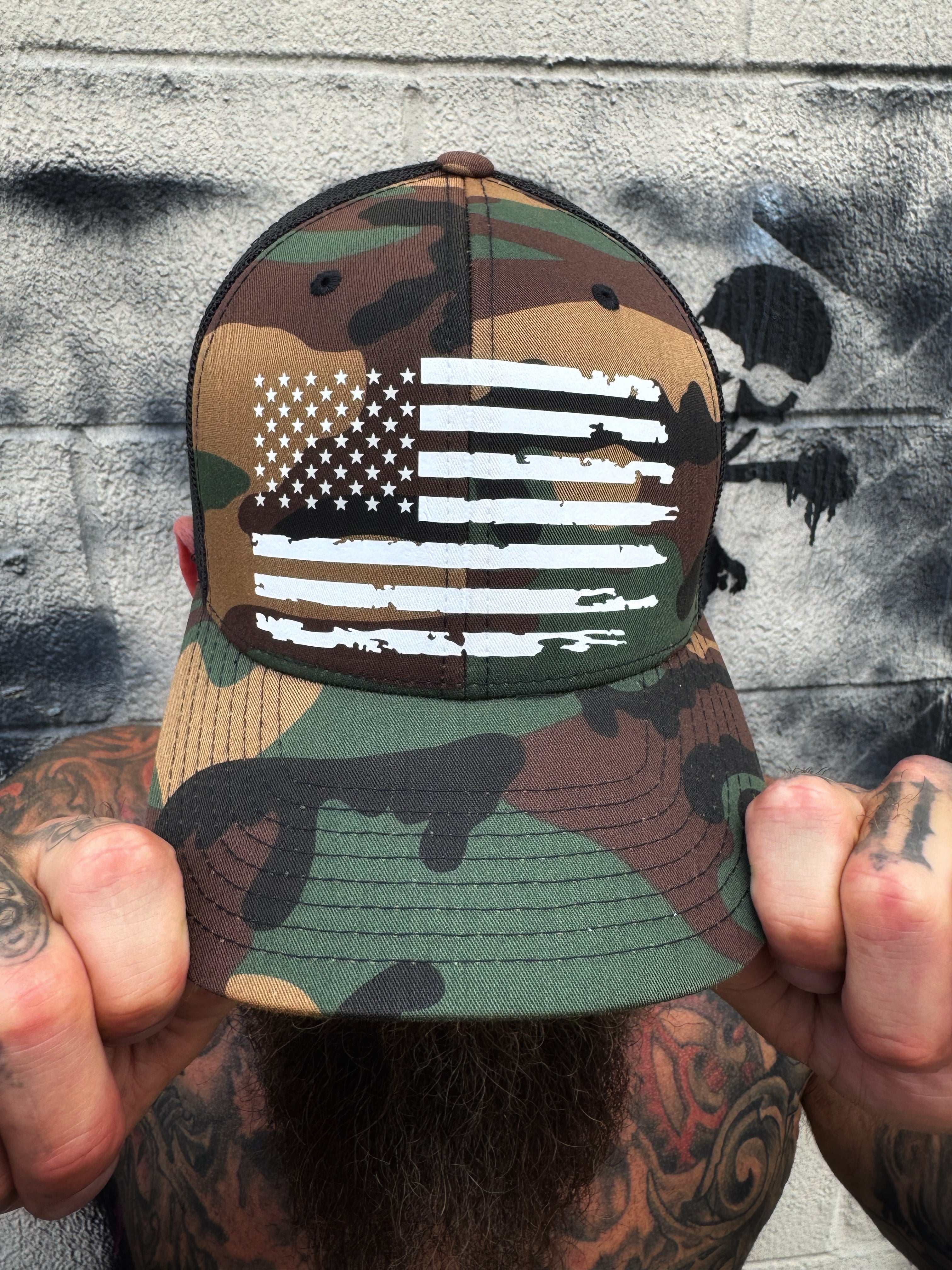 USA WHITE FLAG RETRO TRUCKER GREEN CAMO HAT